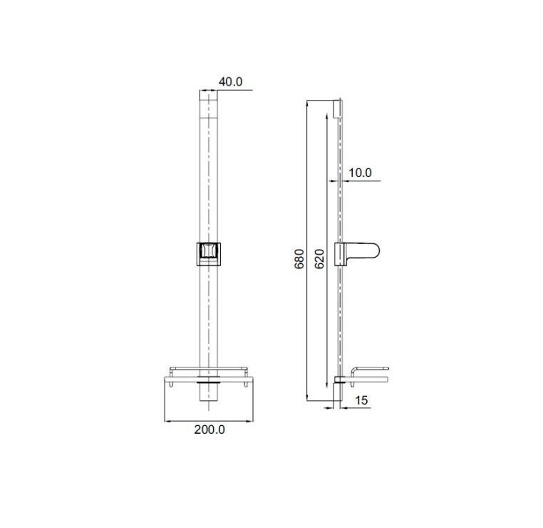 Комплектация: полка, держатель лейки, крепления; Материал: нержавеющая сталь; Высота стойки: 68 см, сечение прямоугольное