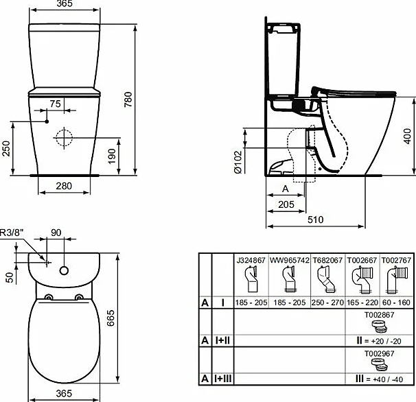 Напольный пристенный унитаз для монтажа с бачком E797001 или E785601, для монтажа с сидением и крышкой E712801/E712701 (обычное) или E772301/E772401 (тонкое), горизонтальный выпуск, с крепежом TT0257919.