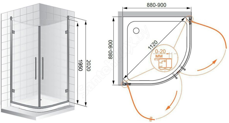 Размеры: 900x900x1950 мм (максимальная высота 2020 мм)