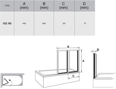 Стандартная высота шторы 1400 мм. Штора для ванны VS2 в сложенном виде имеет ширину 545 мм. Повернув VS2 на 180°, получите Л/П варианты входа. Возможно изготовление атипичной шторы для ванны.