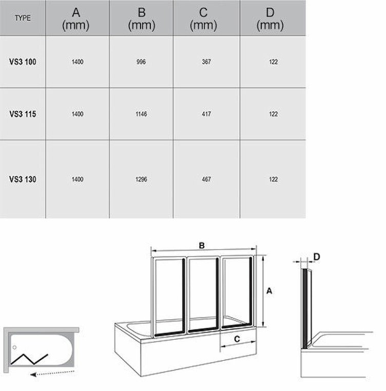 Все три секции душевой шторы VS3 – подвижные. Полотно компактно складывается вовнутрь, открывает удобный доступ к чаше и не занимает полезного места в ванной комнате. Шторка предназначена для классических ванн с прямым передним краем, при небольшой адаптации подходит к асимметричной модели Ravak BeHappy II.