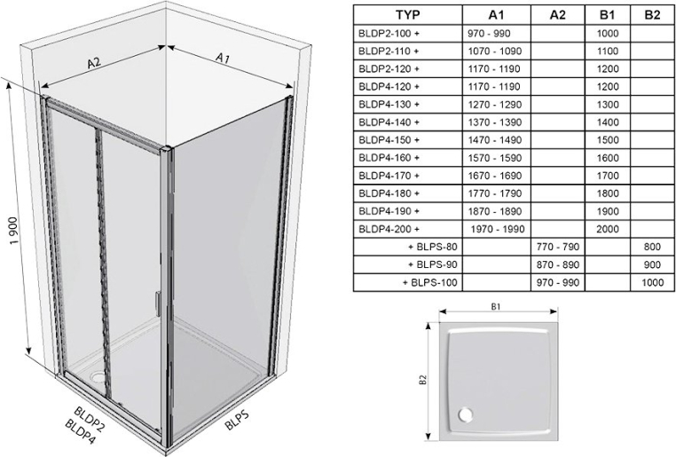 Изделие состоит из одной неподвижной части и одной подвижной, образующей двери. Устанавливается в облицованный кафелем угол ванной комнаты (идеально для облицованной ниши или для комбинации с неподвижной стенкой BLPS) на поддоны RAVAK PERSEUS, PERSEUS PRO, PERSEUS PRO FLAT, PERSEUS PRO CHROME, GIGANT PRO, GIGANT PRO FLAT, GIGANT PRO CHROME или непосредственно на пол со встроенным душевым каналом или трапом. Комбинация с двумя неподвижными стенками типа BLPS позволяет создать „П“-образный душевой уголок. Регулирующий профиль BLNPS позволяет расширить изделие на 20 мм. Возможно изготовление атипичных душевых дверей.
