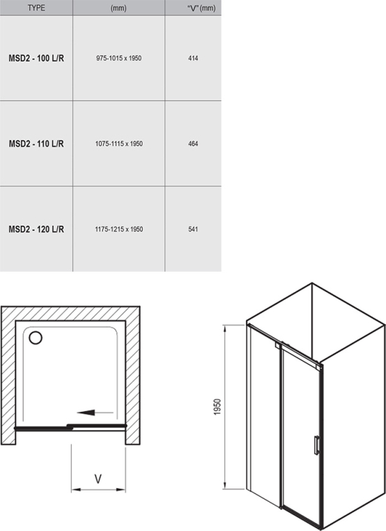 Изделие состоит из двух частей, одна из которых образует раздвижные двери. Левый или правый варианты открывания дверей определяются тем, на какой стороне, при виде снаружи, находятся петли. Устанавливается в облицованную кафелем ванную комнату (в нишу) на поддоны Perseus Pro Chrome, Gigant Pro Chrome или непосредственно на пол со встроенным душевым каналом или трапом.