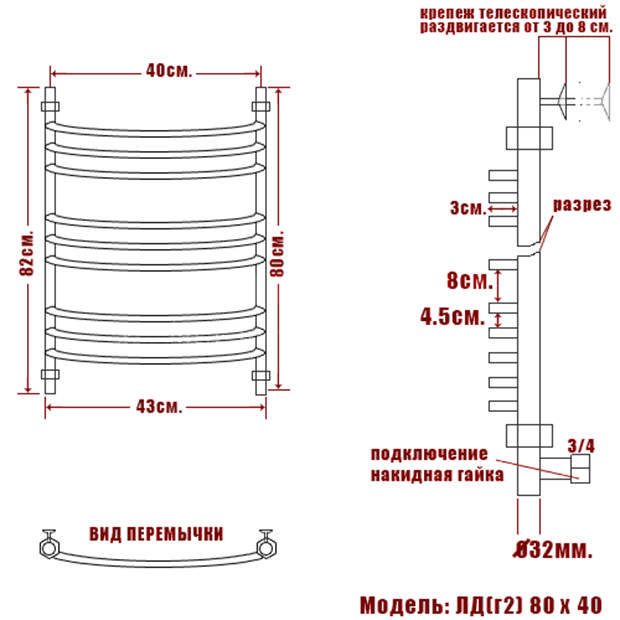 Данный полотенцесушитель выполнен в форм-факторе "лестница" и представляет соединенные между собой продольно и поперечно стойки и перемычки, излучающие, в зависимости от типажа, тепло за счет нагрева от водяного теплоносителя или электроэнергии.
