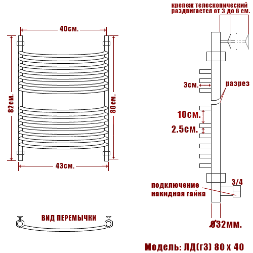 Данный полотенцесушитель выполнен в форм-факторе "лестница" и представляет соединенные между собой продольно и поперечно стойки и перемычки, излучающие, в зависимости от типажа, тепло за счет нагрева от водяного теплоносителя или электроэнергии.