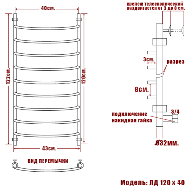 Данный полотенцесушитель выполнен в форм-факторе "лестница" и представляет соединенные между собой продольно и поперечно стойки и перемычки, излучающие, в зависимости от типажа, тепло за счет нагрева от водяного теплоносителя или электроэнергии.