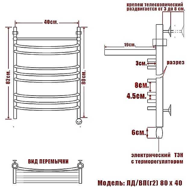 Данный полотенцесушитель выполнен в форм-факторе "лестница" и представляет соединенные между собой продольно и поперечно стойки и перемычки, излучающие, в зависимости от типажа, тепло за счет нагрева от водяного теплоносителя или электроэнергии.