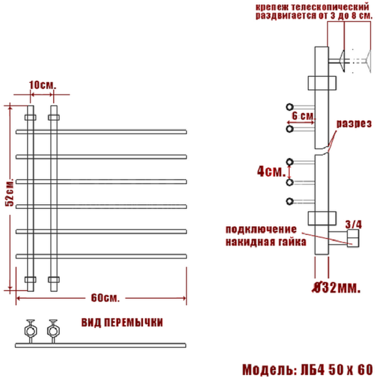 Полотенцесушители ЛБ 4 представляют собой модель классической конструкции типа «лесенка» с двумя вертикальными стойками, поверх которых расположены горизонтальные перемычки. Особенностью модели является расположение перемычек относительно стояков, что придает модели особенный, неповторимый вид.