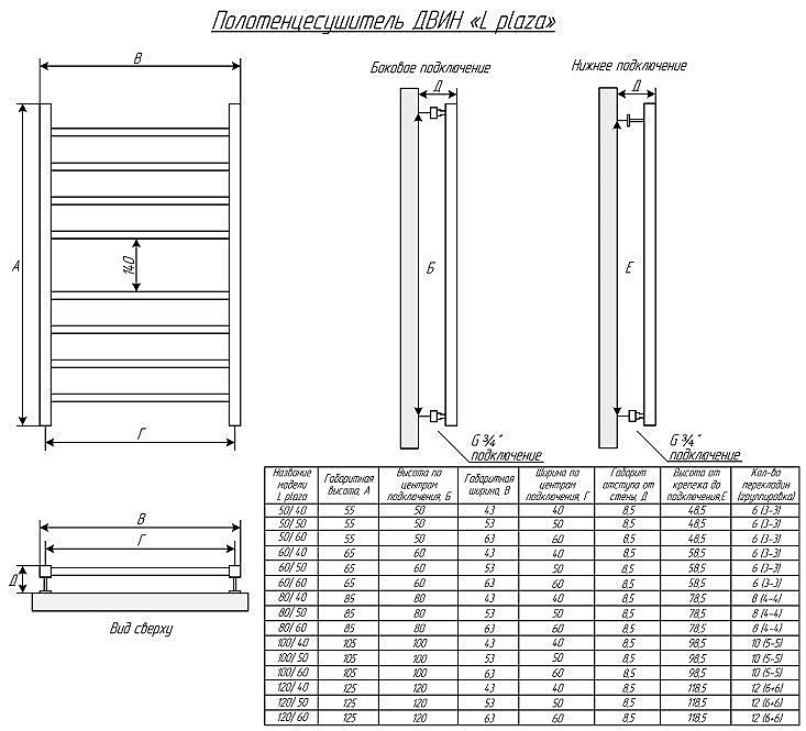 Главная отличительная черта изделий - полный комплект фурнитуры: в комплекте квадратные уголки, квадратные крепежи и квадратные отражатели. Лесенки серии Plaza так же как и другие полотенцесушители ДВИН имеют универсальное подключение - нижнее, боковое, диагональное.
