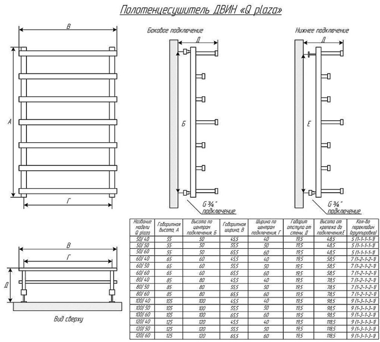 Главная отличительная черта изделий - полный комплект фурнитуры: в комплекте квадратные уголки, квадратные крепежи и квадратные отражатели. Лесенки серии Plaza так же как и другие полотенцесушители ДВИН имеют универсальное подключение - нижнее, боковое, диагональное.