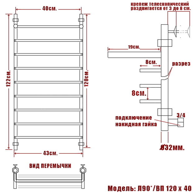 Полотенцесушитель водяной Ника QVADRO 43x122 Л 90 ВП 120/40 хром