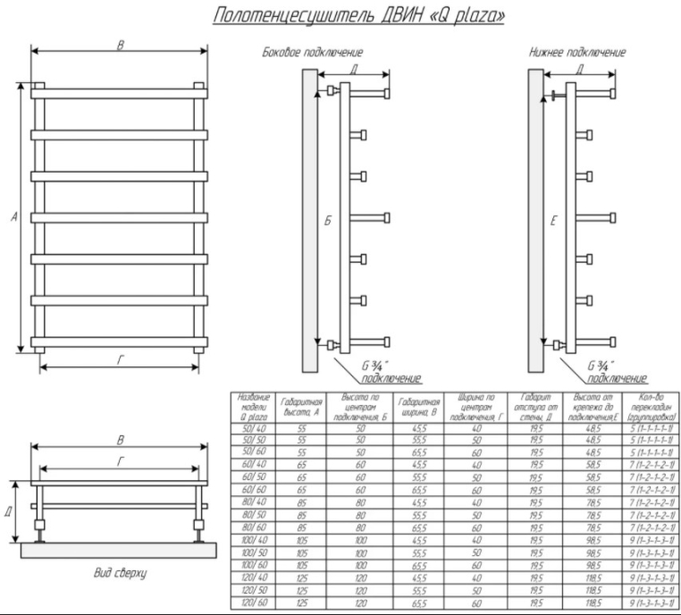 Главная отличительная черта изделий - полный комплект фурнитуры: в комплекте квадратные уголки, квадратные крепежи и квадратные отражатели. Лесенки серии Plaza так же как и другие полотенцесушители ДВИН имеют универсальное подключение - нижнее, боковое, диагональное.