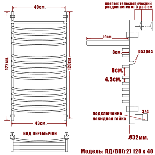Данный полотенцесушитель выполнен в форм-факторе "лестница" и представляет соединенные между собой продольно и поперечно стойки и перемычки, излучающие, в зависимости от типажа, тепло за счет нагрева от водяного теплоносителя или электроэнергии.