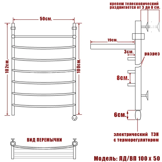Полотенцесушитель Электрический Ника ARC 1000х530 хром (ЛД ВП 100/50 прав)