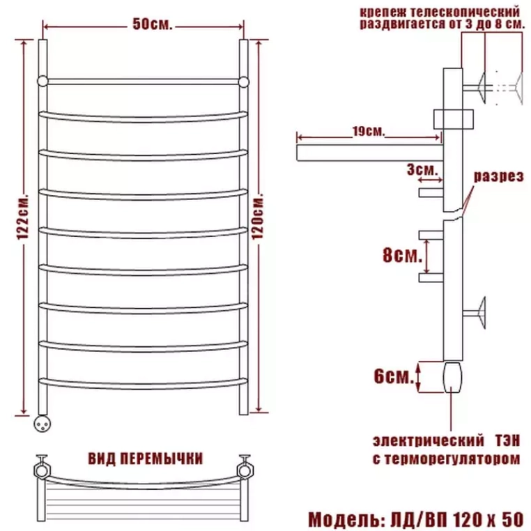 Полотенцесушитель Электрический Ника ARC 1200х530 хром (ЛД ВП 120/50 лев)