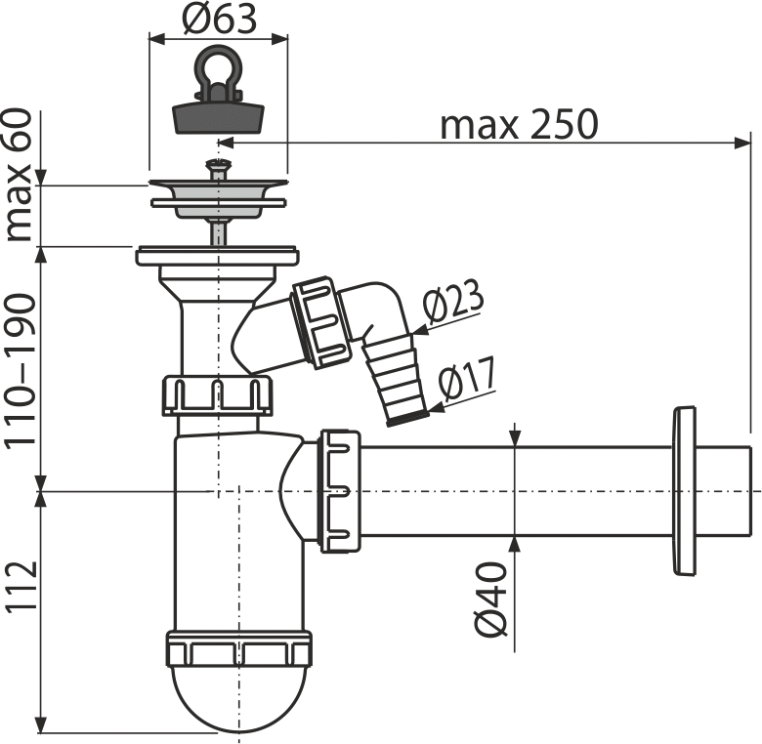Сифон для умывальника DN40 AlcaPlast A41P со штуцером и нержавеющей решеткой DN63
