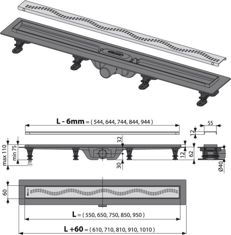 Душевой лоток AlcaPlast Simple с решеткой и опорами APZ8-550M
