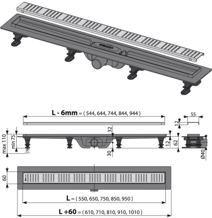 Душевой лоток AlcaPlast Simple с решеткой и опорами APZ10-750M