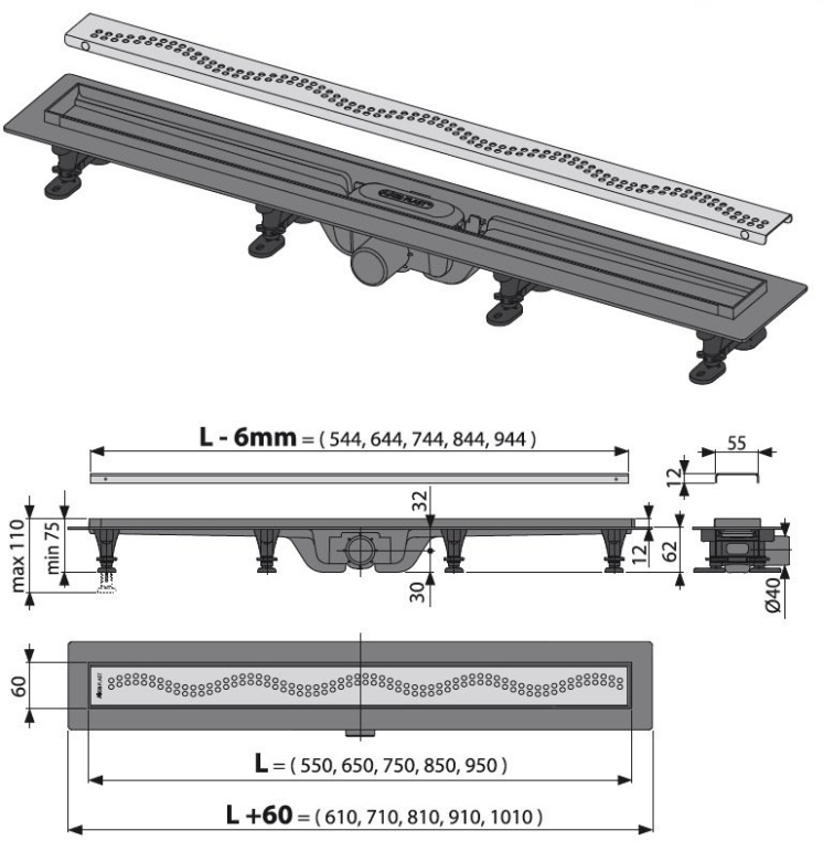Душевой лоток AlcaPlast Simple с решеткой и опорами APZ8-650M комбинированный затвор