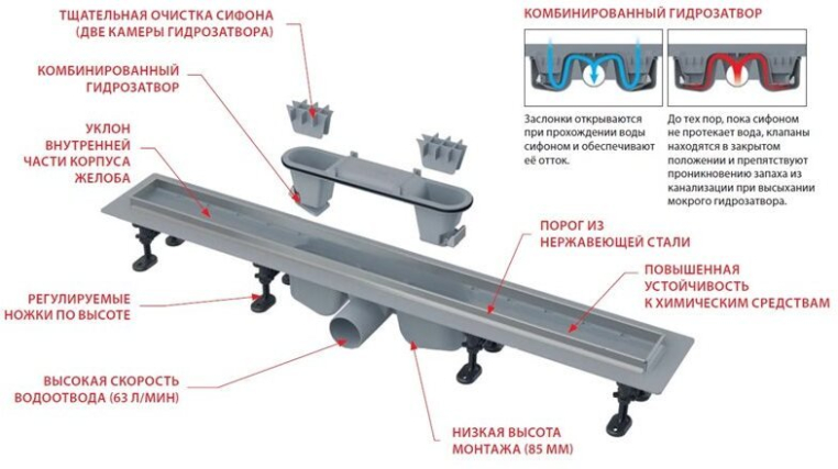 Комбинированный гидрозатвор обеспечивает надежную защиту от проникновения запаха из канализации и после высыхания воды в сифоне