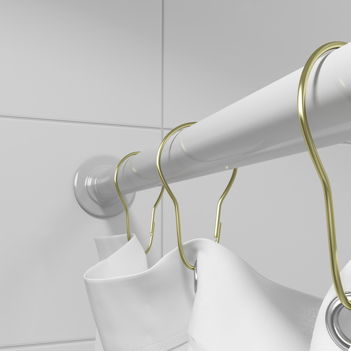 Набор фигурных колец для комплектации шторы в ванную комнату гармонично впишется в любой современный и классический интерьер. Кольца изготовлены из сплава металлов с благородным золотым покрытием, благодаря чему они подойдут к шторам в любой цветовой гамме. Прочная металлическая основа колец, несмотря на изящный внешний вид, выдержит текстиль из любых материалов, в том числе тяжелые шторы. В комплекте 12 колец.