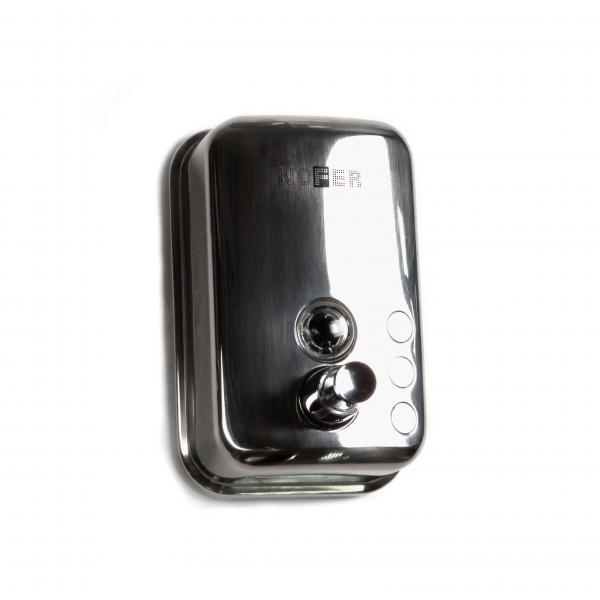 Nofer (Нофер) INOX глянцевый 600 мл (03001.06.В) – это компактный дозатор для жидкого мыла, сделанный в прочном металлическом корпусе. Благодаря использованию нержавеющей стали на модели не появляется ржавчина. Аксессуар имеет удобную кнопку для подачи моющего средства с дозировкой на одно нажатие – 1 мл.