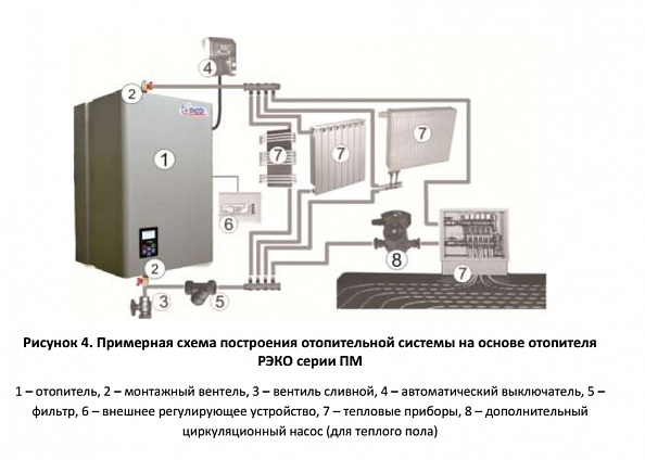 Электрокотлы РЭКО серии ПМ представляет из себя отопитель, укомплектованный циркуляционным насосом, экспанзоматом, предохранительным клапаном и воздухоотводчиком.