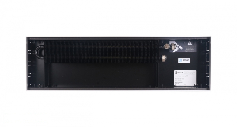 -Теплообменник и корпус конвектора окрашены в чёрный цвет, декоративная крышка закрывает все подключения прибора, что делает все внутренние элементы конвектора невидимыми через декоративную решётку