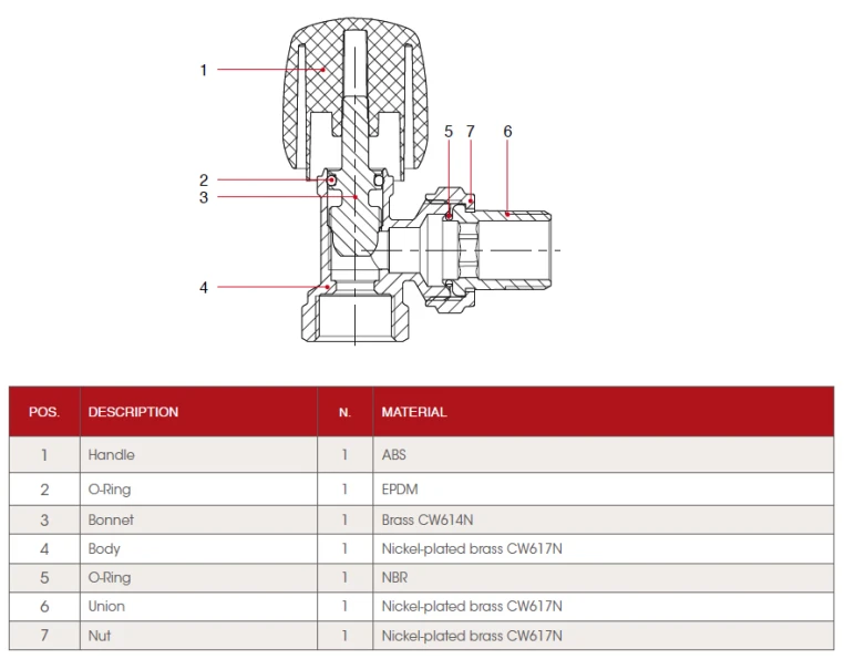 - Материалы: накидная гайка — латунь, хвостовик сгона — латунь, уплотнение сгона - NBR 70-SH/A, шток — латунь, уплотнение штока — EPDM, рукоятка — ABS-пластик