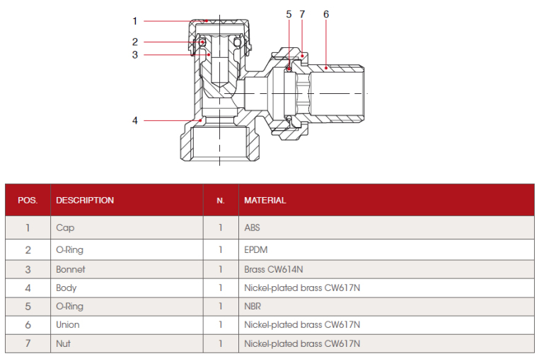 - Материалы: накидная гайка — латунь, хвостовик сгона — латунь, уплотнение сгона - NBR 70-SH/A, шток — латунь, уплотнение штока — EPDM, рукоятка — ABS-пластик