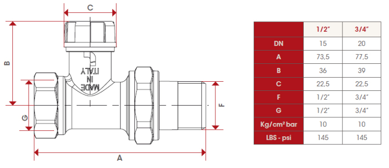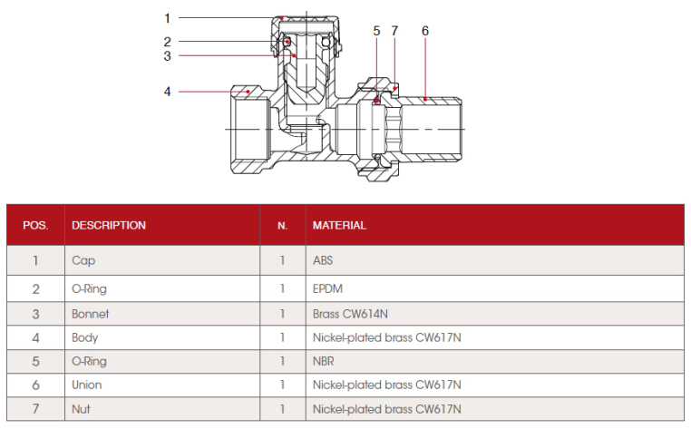 - Материалы: накидная гайка — латунь, хвостовик сгона — латунь, уплотнение сгона - NBR 70-SH/A, шток — латунь, уплотнение штока — EPDM, рукоятка — ABS-пластик