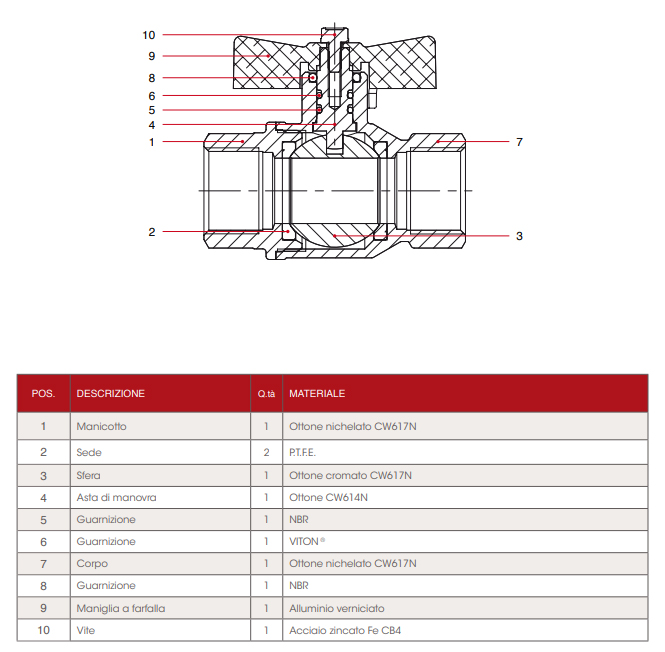 - Материалы: шток — латунь, уплотнение шара — тефлон, шар — латунь, винт — оцинкованная сталь, уплотнения штока — NBR 70 SH/A