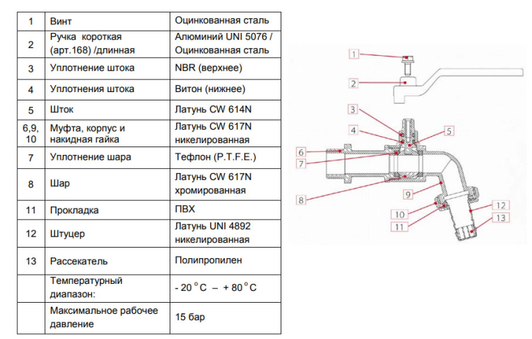 Кран шаровый H-штуцер садовый GAR рычаг ITAP 1/2" сливной с латунным штуцером предназначен для полива, заполнения и слива емкостей. Корпус крана выполняется из никелированной латуни. Минимальная рабочая температура -20 оС, максимальная – до +80 оС. Для подключения к трубопроводу используется внешняя резьба H ISO228. На другом конце крана расположен латунный штуцер с внешней резьбой H. Для перекрытия потока жидкости используется ручка-рычаг из оцинкованной стали, покрытой красной краской. Шар выполняются из хромированной латуни, шток – из латуни, уплотнения – из тефлона, NBR и витона, рассекатель – из полипропилена