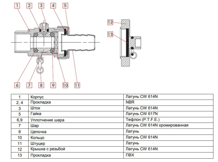 - Материал штока, гайки, кольца, крышка, цепочка: латунь