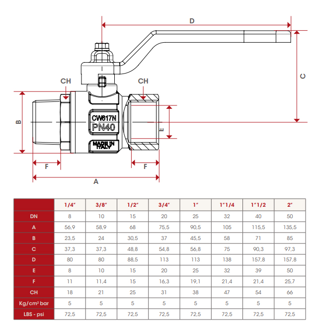 - Материалы: шток — латунь, уплотнение шара — тефлон, шар — латунь, винт — оцинкованная сталь, уплотнения штока — OR-Viton - 70 SH/A, муфта — латунь