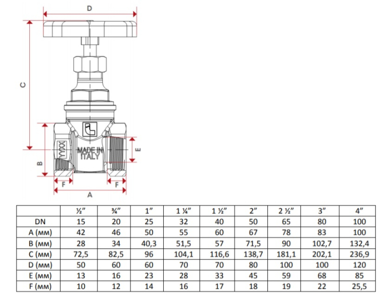 - Материалы: рукоятка - окрашенная сталь, шток — латунь, гайка — сталь, прокладка — NA1002, маховик — сталь, задвижка — латунь, крышка - латунь, гайка сальника — латунь, втулка сальника — латунь, сальник — FE1000