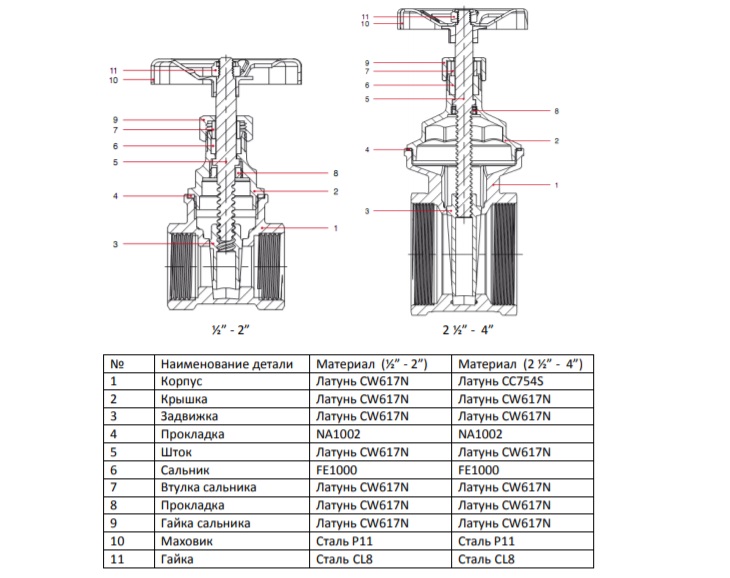 - Материал крышки, задвижки, клина и прокладки, втулка сальника, сальниковая гайка и шток: латунь