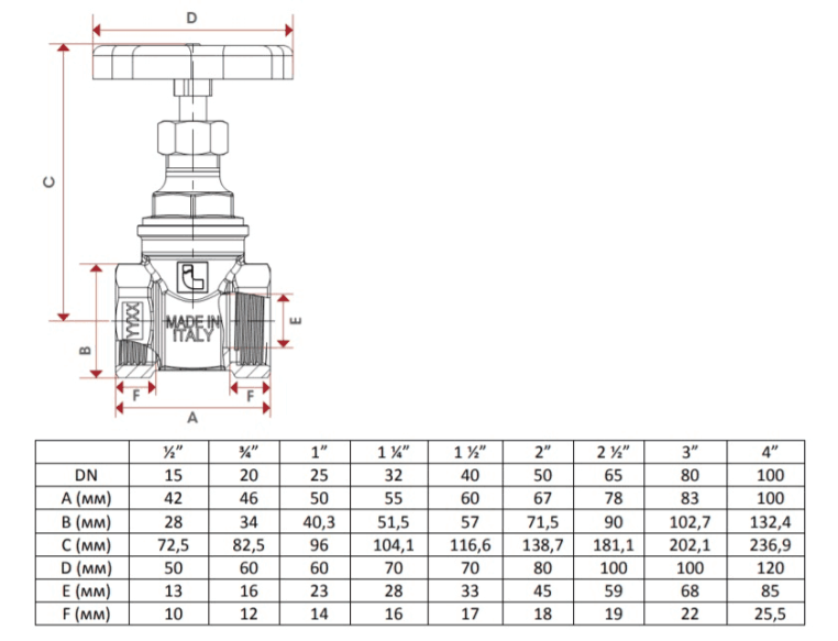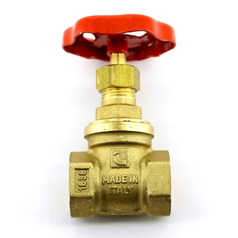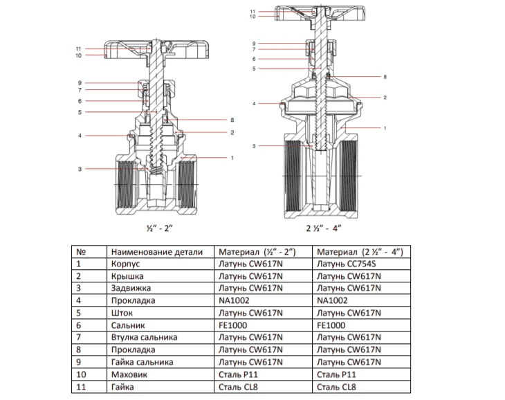- Материал крышки, задвижки, клина и прокладки, втулка сальника, сальниковая гайка и шток : латунь