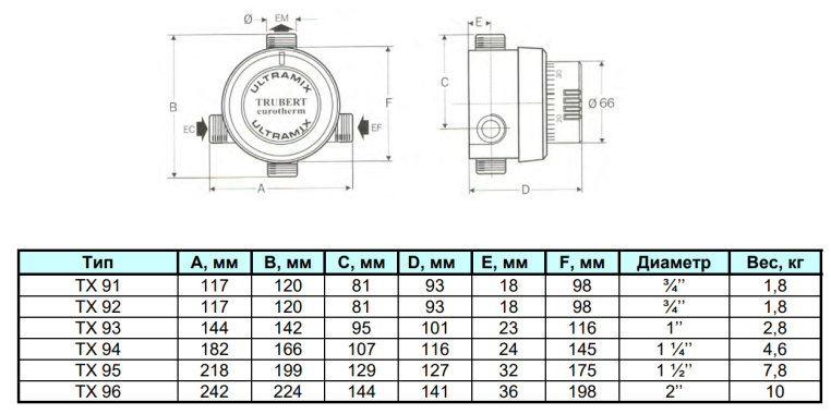 Термосмеситель UltraMix TX93Е Watts Ind внешняя резьба 1" диапазон регулирования 30-70 оС представляет собой термостатический подмешивающий клапан для систем горячего водоснабжения зданий и сооружений, где необходимо поддержание температуры ГВС на одном уровне независимо от колебаний температуры и давления в пределах 1,5 бара в магистрали. Термосмеситель отличается декоративным дизайном, латунным корпусом, с наружным слоем серой эпоксидной краски и синей градуированной ручкой (тип Е) или с хромированием и белой градуированной ручкой (тип С). В приборе реализован механизм с защитой от застревания. Термостатический клапан поставляется с фильтрами механической очистки и обратными клапанами, а также биметаллической полоской (сталь с рильсановым покрытием) для предотвращения образования накипи. Термостатический картридж является сменным.