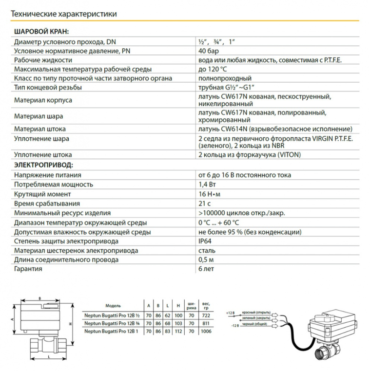 Кран шаровый Neptun Bugatti Pro 12В 3/4" (43054037000003)