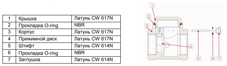 - Материалы: прокладка - NBR, крышка — латунь, штифт — латунь, прижимной диск — латунь, шайба инспекционной пробки — NBR, уплотнительное кольцо шестигранной пробки — NBR, заглушка — латунь