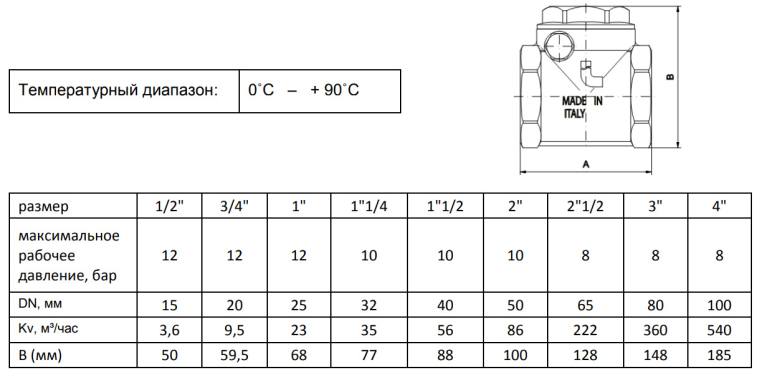 Клапан обратный горизонтальный дисковый ITAP CLAPET 1/2" с металлическим затвором предназначен для предотвращения обратного тока жидкости в пределах допустимых значений по температуре и давлению. Применяется в домашнем холодном и горячем водоснабжении, отоплении, теплоснабжении, трубопроводах котельных. Клапан предназначен для установки на горизонтальных трубопроводах крышкой вверх. Направление потока должно совпадать со стрелкой на корпусе клапана. Корпус обратного дискового клапана CLAPET, а также его крышка, прижимной диск, штифт и заглушка выполняются из латуни, а прокладка O-Ring – из NBR. Температурный рабочий диапазон клапана – от 0 до +90 оС. Максимально рабочее давление – 12 бар. Для присоединения обратного клапана к трубопроводу применяется внутренняя резьба B из латуни