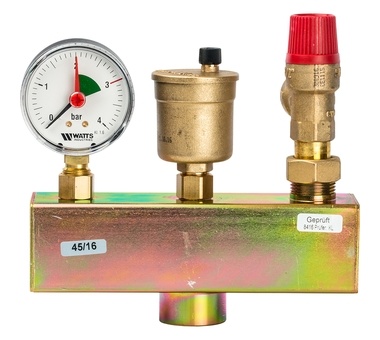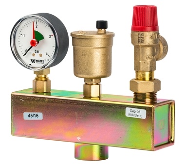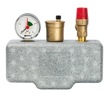 Группа безопасности котла Watts KSG 30 ISO применяется в бытовых отопительных системах мощностью до 50 кВт. В комплект входят предохранительный клапан, воздушный клапан и манометр, смонтированные на консоли в теплоизоляции. Группа безопасности защищает от превышения давления в системе, выполняет функцию отвода воздуха и газов, а также отображает информацию по давлению в системе на уровне манометра.