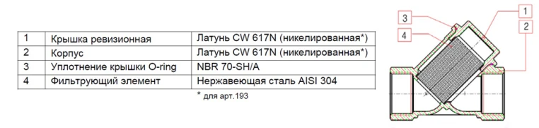 - Материалы: уплотнение крышки NBR 70-SH/A, крышка ревизионная латунь CW617N, материал фильтрующего элемента - нержавеющая сталь AISI 304