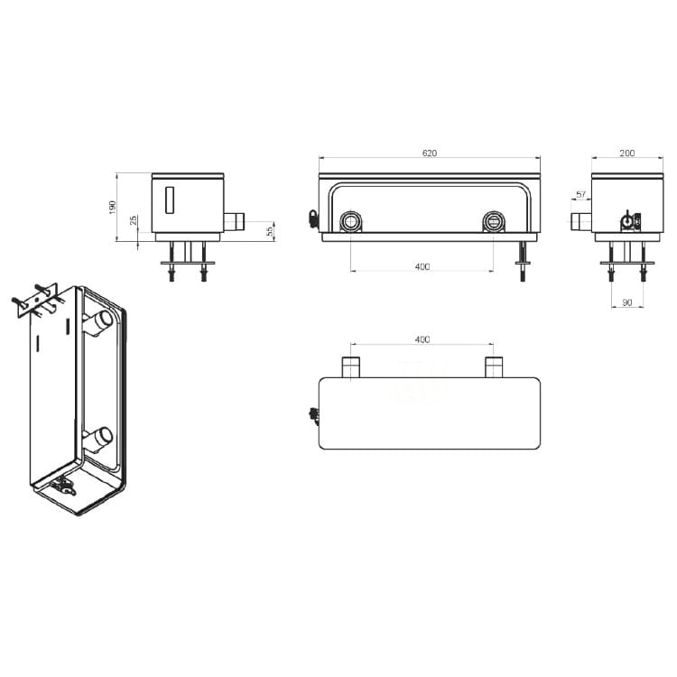 Подключение к источнику: 1½ НГ (DN 25) со стороны котла и потребителя или 2 НГ (DN 32), плоское уплотнение. Для перехода на наружную или внутреннюю резьбу и подключения к источнику можно использовать трубу и фитинги.