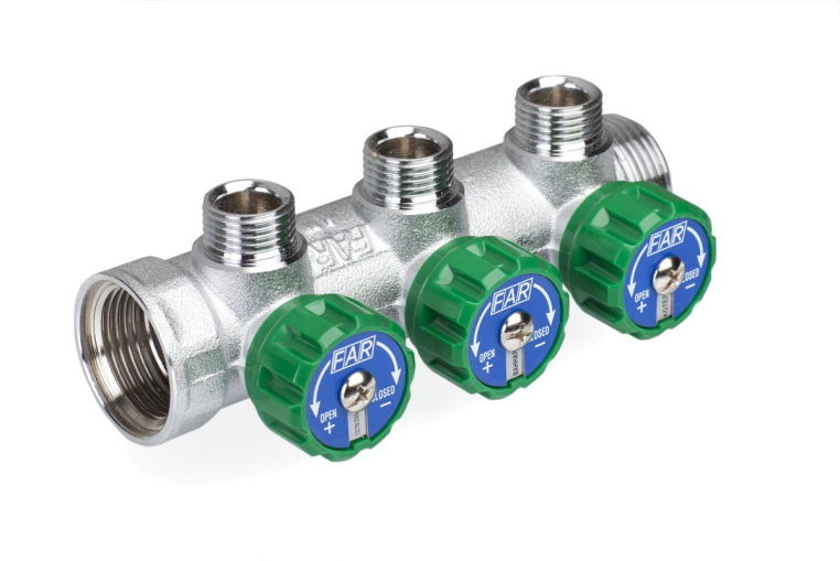Коллекторы FAR со встроенными регулирующими и запорно-балансировочными вентилями. С помощью расположенной на передней поверхности коллектора управляющей ручки вентиля и закрывающегося колпачка отсекателя, пользователь может легко обслуживать систему без каких-либо дополнительных инструментов.