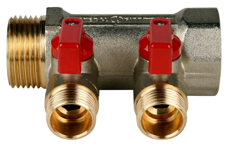 Stout Коллектор с шаровыми кранами 1", 2 отвода 1/2" (красные ручки) (SMB 6200 011202)