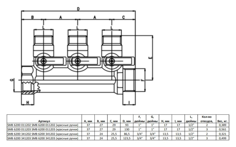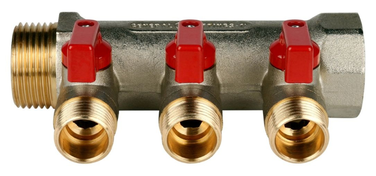 STOUT Коллектор с шаровыми кранами 3/4", 3 отвода 1/2" (красные ручки) (SMB 6200 341203)