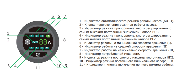Для управления насосом применяется электронная панель управления с множеством режимов работы и встроенной системой самодиагностики. Насос может работать в автоматическом режиме, который обеспечивает адаптирование насоса к потребностям конкретной системы отопления и позволяет эксплуатировать насос без необходимости производить дополнительные настройки. Насос предназначен для установки на вертикальном участке трубопровода, для чего оснащен резьбовыми соединениями от 1"1/2 до 2"