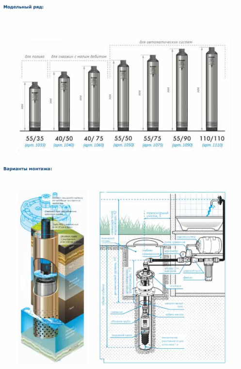 В нижней части насоса расположена водозаборная часть, состоящая из крышки и съемного сетчатого водозаборного фильтра. Фильтр обеспечивает двойную степень защиты насоса, предотвращая всасывание грязи и песка. Конусообразная форма нижней крышки облегчает опускание насоса в скважину при ступенчатом соединении обсадных труб. Благодаря небольшим габаритам насоса, диаметр погружной скважины начинается от 110 мм и больше. «Плавающие» рабочие колеса помогают перекачивать воду с содержанием песка до 2 кг на 1 куб.м воды. Пропускная способность твердых частиц составляет до Ø1,5 мм. Возможна работа насоса при частичном погружении его в воду на 10-15 см.
